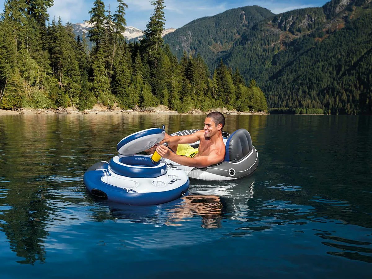 De Intex River Run is een opblaasbare, brede zwemband met rugsteuntje zodat deze als loungestoel gebruikt kan worden. De zitting van gaasmateriaal laat water door voor extra verkoeling.